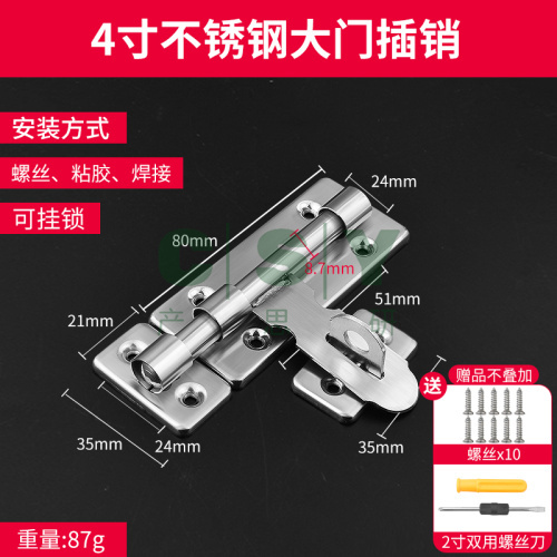 规格:4寸 不锈钢大门插销左右通用 可挂锁(送螺丝+螺丝刀)