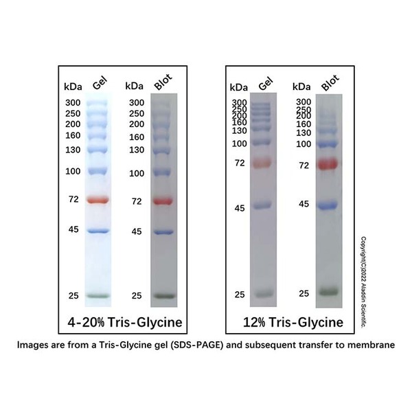 彩色预染蛋白分子量标准 (25-300kDa),25-300kDa, 25 Green/ 45 Blue/ 72 Orange/ 100 Blue/ 130 Blue/ 160 Blue/ 200 Blue/ 250 Blue/ 300 Blue kDa,250μl