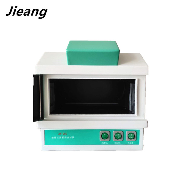 暗箱式三用紫外分析仪采用石英玻璃紫外灯管及滤光片组成,两组光源的波长分别为254nm和365nm。光源经滤光片滤色即可用于实验,两种光源既能单独使用亦可同时混合使用。