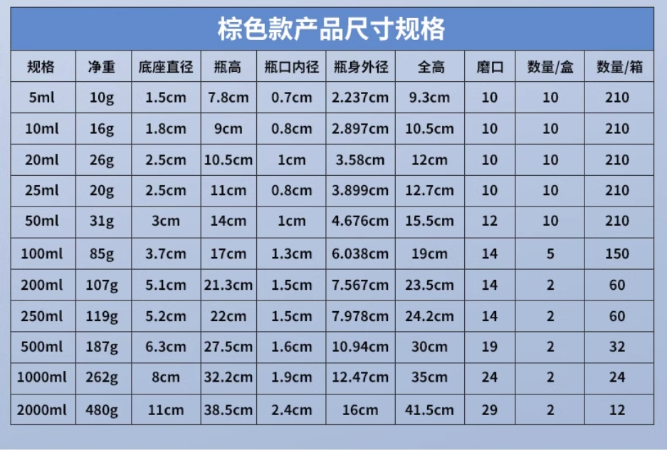 容量瓶,标配玻璃塞,棕色玻璃,5ml | 5ml棕色 1个 | >点击购买< |