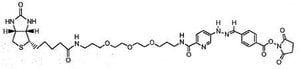 A modified biotin conjugate in which biotin is linked to a bis-aryl hydrazone chromophore and aromatic succinimidyl ester via a long-chain PEG4 linker. The bis-aryl hydrazone chromophore allows for direct spectrophotometric quantitation of total incorporated biotin. The long-chain PEG4 linker preserves biotin/avidin affinity as well as increases solubility. The aromatic succinimidyl ester allows for higher efficiency modification of amines in aqueous buffers.