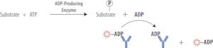 The Transcreener® HTS Assay platform overcomes the need for time-consuming, one-off assay development for individual members within a group transfer enzyme family by utilizing a single set of assay reagents that detect an invariant product. The generic nature of the Transcreener® HTS Assay platform eliminates delays involved in assay development for new HTS targets, and greatly simplifies compound and inhibitor profiling across multiple target families. The Transcreener® ADP2 FP Assay is a far-red, competitive fluorescence polarization (FP) assay based on the detection of ADP and therefore is compatible with any enzyme class that produces ADP, including protein, lipid, and carbohydrate kinases, ATPases, DNA helicases, carboxylases and glutamine synthetase. The Transcreener® ADP2 Assay is a simple one step homogenous detection assay, and is extremely flexible with regard to ATP concentration (0.1 to 1,000 μM ATP). The assay provides excellent signal at low substrate conversion, with a Z’ = 0.7 and = 85 polarization shift (mP) at 10% ATP conversion using 1 μM ATP. The Transcreener® ADP2 FP Assay was developed to follow the progress of any enzyme that produces ADP. The Transcreener® ADP Detection Mixture comprises an ADP Alexa633 Tracer bound to an ADP2 Antibody. The tracer is displaced by ADP, the invariant product generated during the enzyme reaction.The displaced tracer freely rotates leading to a decrease in fluorescence polarization. The assay uses a far red tracer to minimize interference from fluorescent compounds and light scattering. View full Transcreener® product list