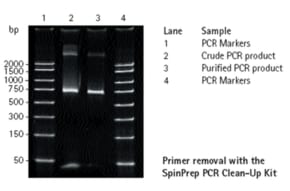 The SpinPrep PCR Clean-Up Kit is designedfor the rapid purification of DNA amplifiedin PCR. The 10-minute procedure involvesaddition of a binding buffer followed byadsorption of the DNA to a silica membrane ina spin column format. Following a wash step,the DNA is eluted in low-salt buffer. This kitremoves DNA polymerases, dNTPs, salts, and> 99% of primers so that they do not interferewith downstream applications such as cloning,sequencing, or labeling. PCR products from100 bp to > 12,000 bp can be cleaned up, withrecoveries of amplified DNA in the range of60-90% under standard conditions. Column binding capacity: up to 6 g PCR volume: 100 l/rxn Typical recovery: 6090% Size range: 100 bp to > 12,000 bp Time required:< 10 min