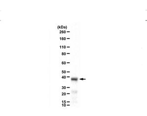 ~38 kDa observed. Band size appears larger than the calculated molecular weight of 31.97 kDa (Met1 removed) due to posttranslational modification (acetylation and/or phosphorylation). Uncharacterized bands may be observed in some