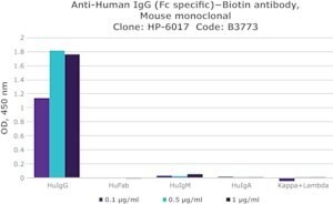 小鼠中产生的单克隆抗人IgG(Fc特异性)-生物素抗体在工作稀释度1:80,000下适用于ELISA。用于标记小鼠脾细胞和通过流式细胞仪分析。