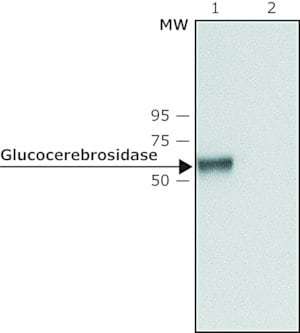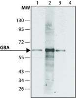 葡糖脑苷脂酶是一种具有葡糖神经酰胺酶活性的酶。溶酶体水解酶葡糖脑苷脂酶缺陷导致戈谢病。GBA 的突变将阻碍或阻碍 GBA 向内质网的转运。可用抗葡萄糖脑苷脂酶(C 端)抗体孵育 SDS-PAGE 凝胶 。抗葡萄糖脑苷脂酶抗体与人 GBA 发生特异性反应。