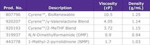 我们致力于为您带来更加绿色的替代产品,这些产品遵守一项或多项绿色化学12项原则。该产品是可生物再生的,符合″更安全的溶剂和助剂″以及″使用可再生原料″的原则。了解生物基双极性非质子溶剂——二氢左旋葡萄糖酮(Cyrene)的更多信息。 Cyrene是生物基双极性分子,生命周期终止处理后,安全降解成为CO₂和H₂O。可作为非质子类溶剂取代存在环境问题的普通溶剂。REACH将许多溶剂归为SVHC高度关注物质,其中包括N-甲基吡咯烷酮(NMP)和N,N-二甲基甲酰胺(DMF),Cyrene™正是这些溶剂的替代品。