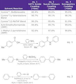 Cyrene在某些应用中可取代NMP和/或DMF,比如对于石墨烯溶液而言,Cyrene由于适宜的极性和高粘度,可以制备较大且缺陷较少的石墨烯薄片,分散能力超过NMP。下为Cyrene™的更多用途。 1.石墨烯溶液分散。 2.替代DMF用于金属有机骨架合成。 3.有机合成: •Cacchi型环化 •尿素合成 •HATU酰胺偶联——在酰胺和二肽偶联反应中替代DMF。 •Suzuki-Miyaura偶联反应。 •Sonogashira偶联反应。
