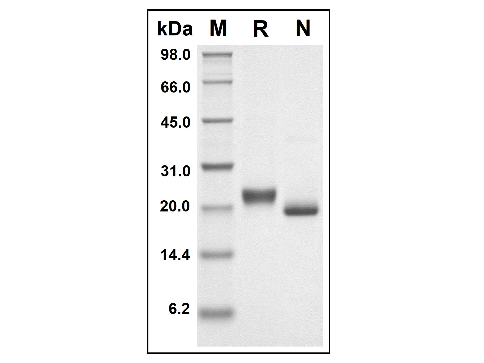 Recombinant Human TNFRSF1A Protein was resolved with SDS-PAGE under reducing (R) and non-reducing (N) conditions and visualized by Coomassie® Blue staining. Showing a single band at 21.2 kDa under reducing conditions and 19.0 kDa under non-reducing conditions.