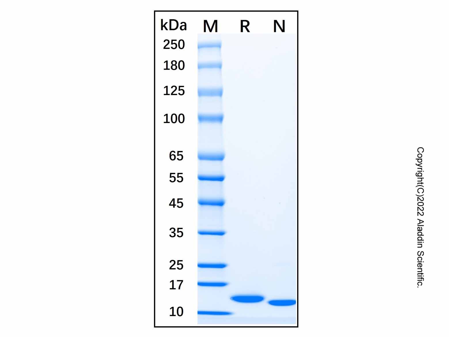 3μg/lane of Recombinant Mouse IL-7 Protein was resolved with SDS-PAGE under reducing (R) and non-reducing (N) conditions and visualized by Coomassie® Blue staining. Showing a single band at 12.9 kDa under reducing conditions and 12.1 kDa under non-reducing conditions.