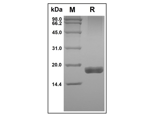 Recombinant Human TRAIL R2/TNFRSF10B Protein was resolved with SDS-PAGE under reducing (R) and visualized by Coomassie® Blue staining. Showing a single band at 16.3 kDa.