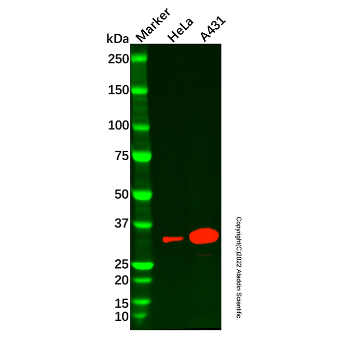 阳性对照:WB: A431 and HeLa cell lysates. IHC: Human liver tissue. IF/ICC: HeLa cells.