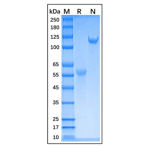 3 μg/lane of Recombinant Human CD40 Protein was resolved with SDS-PAGE under reducing (R) and non-reducing (N) conditions and visualized by Coomassie® Blue staining, showing the band at 57.5 kDa under reducing conditions and 113.9 kDa under non-reducing conditions.