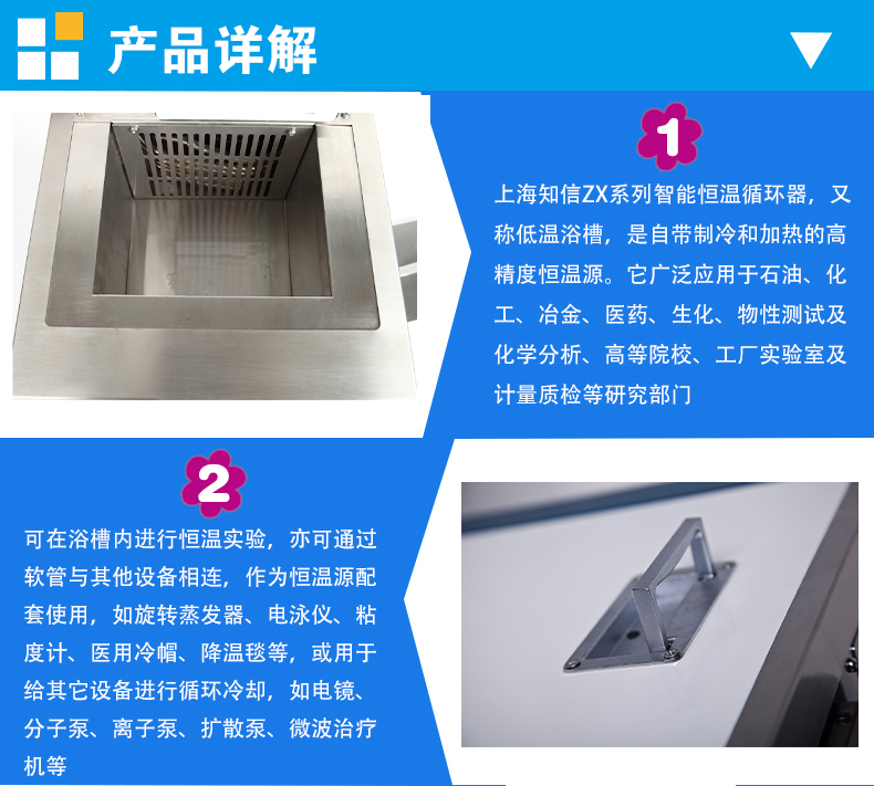 智能恒温循环器又称低温浴槽,是自带制冷和加热的高精度恒温源。它广泛应用于石油、化工、冶金、医药、生化、物性测试及化学分析、高等院校、工厂实验室及计量质检等研究部门。可在浴槽内进行恒温实验,亦可通过软管与其他设备相连,作为恒温源配套使用,如旋转蒸发器、电泳仪、粘度计、医用冷帽、降温毯等,或用于给其它设备进行循环冷却,如电镜、分子泵、离子泵、扩散泵、微波治疗机等。