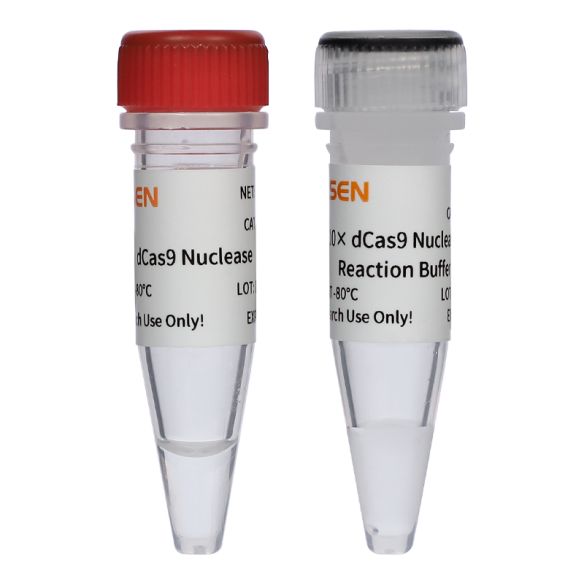 翌圣生物通过对Cas9经过点突变(D10A和H840A突变)获得dCas9 (deactivated Cas9)。不同于Cas9,dCas9仅有结合靶标DNA的能力,不能切割靶标DNA,可用于转录水平调控研究(体内)。在体外,dCas9可以用来调取特异靶标序列,可用于后续的实验研究。与Cas9一样,dCas9的反应体系也需要添加sgRNA(sgRNA或者crRNA: tracrRNA),因此,整个体系(包括Cas9酶)都不能含有任何核酸酶。