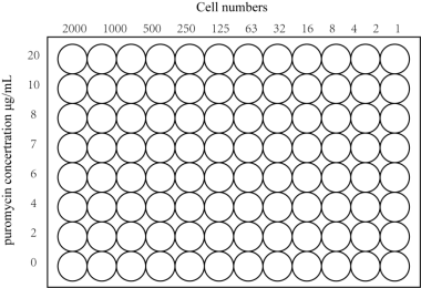 将细胞如下图1稀释。给药7天后,弃培养液,用台盼蓝染色2 min,显微镜下观察细胞存活情况。确定细胞多克隆细胞筛选和单克隆细胞筛选浓度。