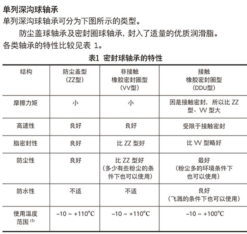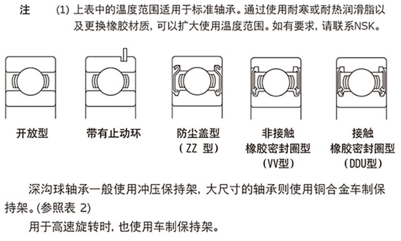 单列深沟球轴承,是滚动轴承中最具有代表性的结构,用途广泛。除承受径向负荷之外,还可以承受二个方向的轴向负荷。摩擦力矩小,最适用于要求高速旋转,低噪音,低振动之用途。这种轴承,除开放式之外,还有加钢板防尘盖的轴承,加橡胶密封圈的轴承,或者在外圈外径上附有止动环的轴承。一般多采用钢板冲压保持架。深沟球轴承,大尺寸的轴承则使用铜合金车制保持架。用于高速旋转时,也使用车制保持架。 |