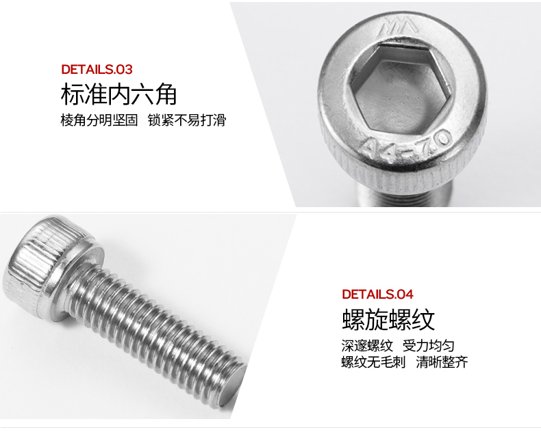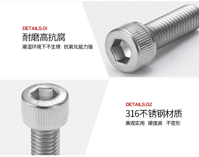 4)保持螺纹清洁,为确保螺丝和螺帽配合顺畅,建议把产品装在干净的容器内取用,勿随意放置。