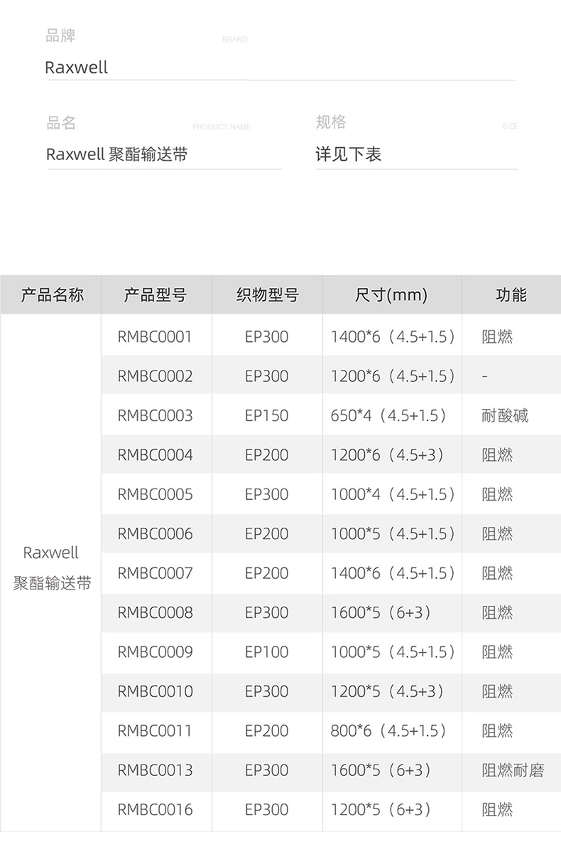 "Raxwell 聚酯输送带,RMBC0010 EP300 1200*5(4.5+3),阻燃 售卖规格:1卷"商品可能已被商家删除,您可查看其他相似商品!