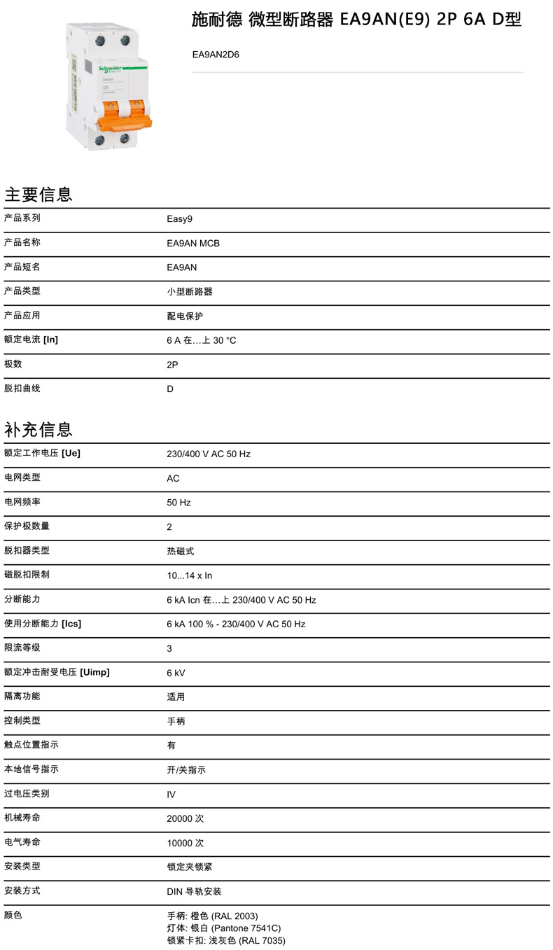 "施耐德 微型断路器 EA9AN(E9) 2P 6A D型,EA9AN2D6 售卖规格:1个"商品可能已被商家删除,您可查看其他相似商品!