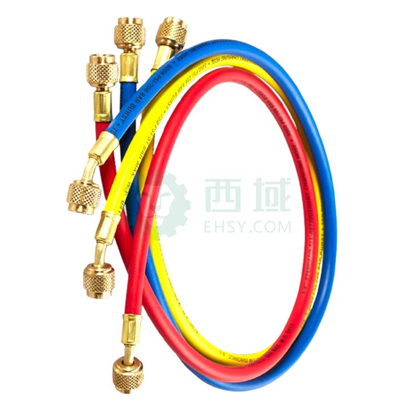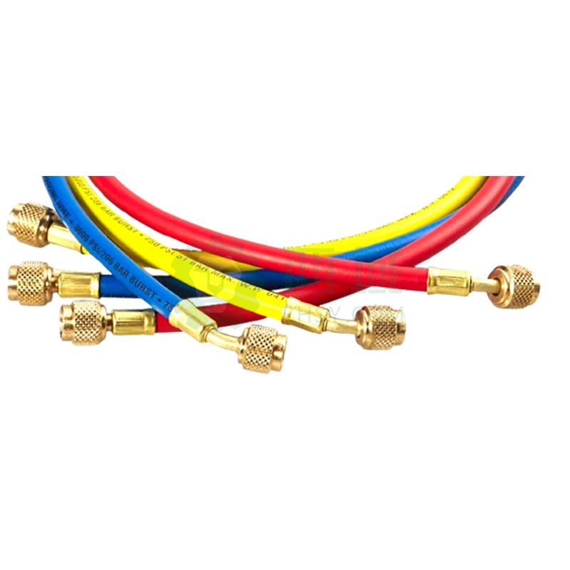3根0.9米的加液管,所有接头尺寸都是1/4"。 工作压力800psi(54bar),爆破压力4000psi(272bar)。 连接螺母内侧有加宽加深的排气导向槽,拧松螺母时引导冷媒向前排出,避免冻伤手。 管子柔韧性出众,摆动过程中对接头反向作用力很小,防止接头松动。 |