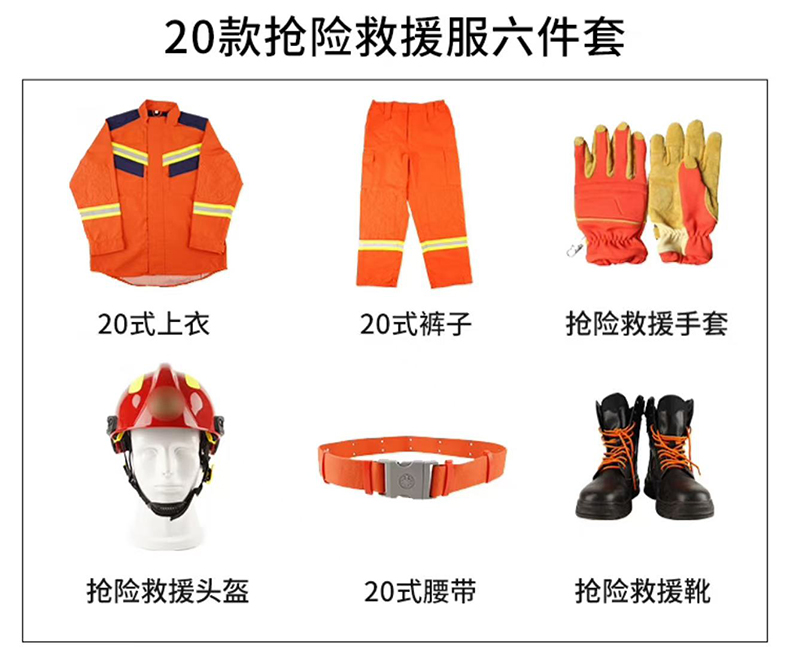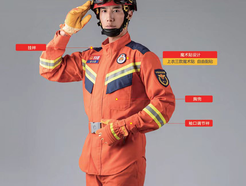 用于建筑倒塌、狭窄空间及攀登等救援现场的身体防护。具备阻燃、耐磨、轻便、抗拉力强、颜色及标识醒目等性能。抢险救援服是消防员在进行抢险救援作业时穿着的专用防护服。