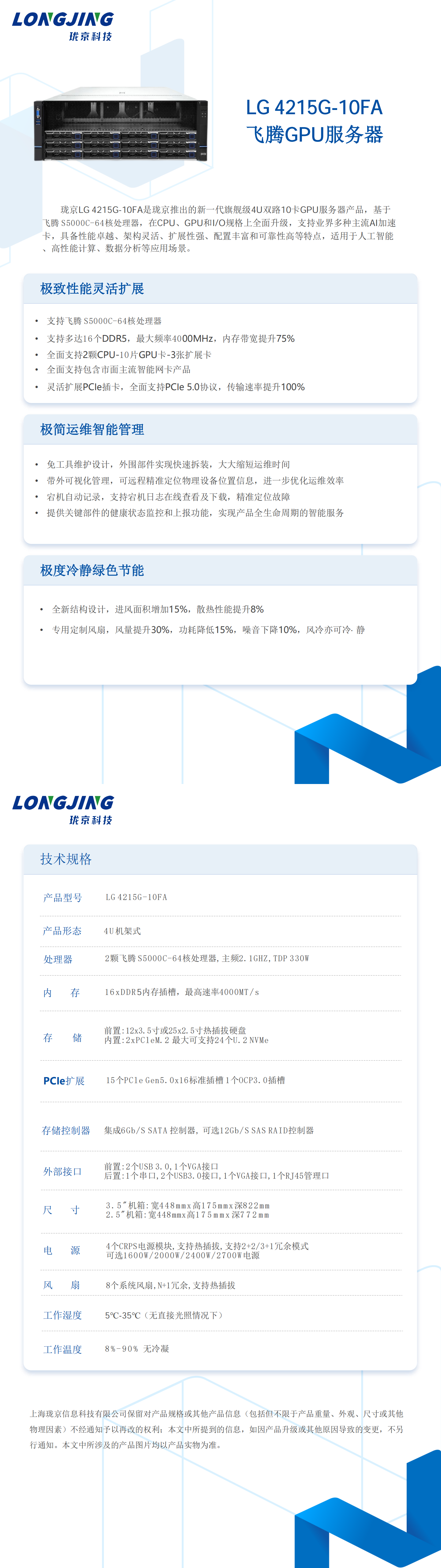 "珑京 LG 4215G-10FA 国产CPU处理器 自研可控机架服务器双路飞腾 FT S5000C 64核心 深度学习 高性能计算4U服务器"商品可能已被商家删除,您可查看其他相似商品!