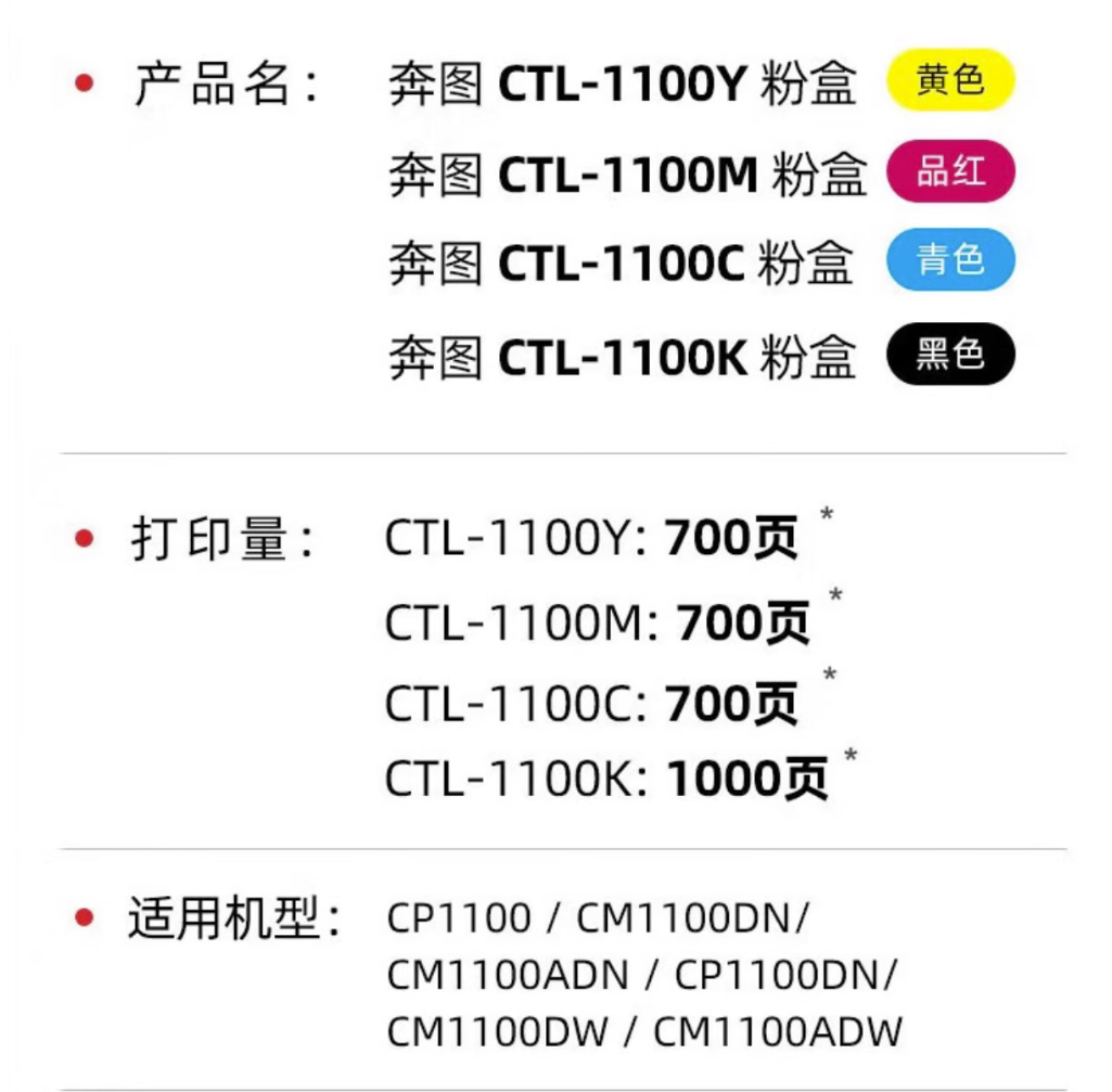 "奔图硒鼓套装:CTL-1100K黑色 CTL-1100C青色 CTL-1100M红色 CTL-1100Y黄色, 鼓粉一体"商品可能已被商家删除,您可查看其他相似商品!