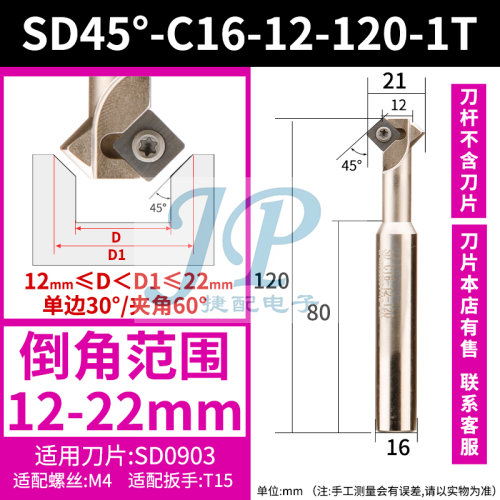"数控倒角刀杆内孔倒角刀60度机夹加工中心正反双面去毛刺直柄倒角-SD45°C16-12-120-1T【柄径16】【总长120】【刃数1】 【加工范围12-22】"商品可能已被商家删除,您可查看其他相似商品!