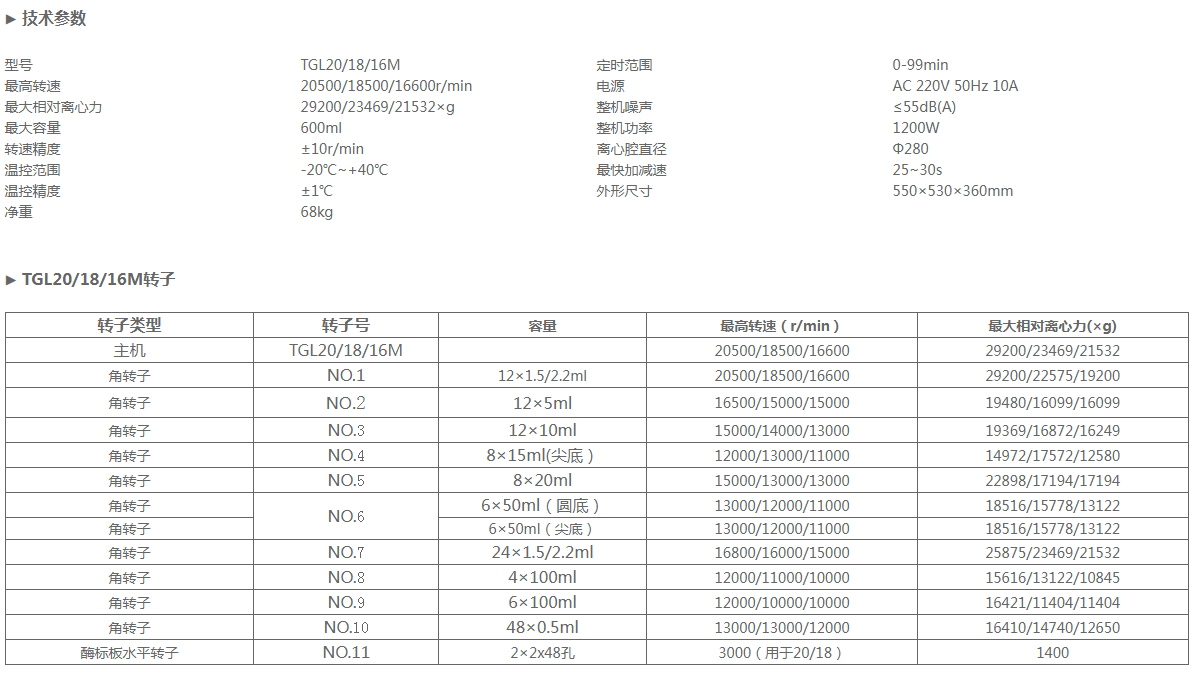 尺寸 : 最高转速20000 最大离心力27810 容量600ml 主机带NO.1转子TGL20M——商品选配件 以下超链接 选购~~~ |