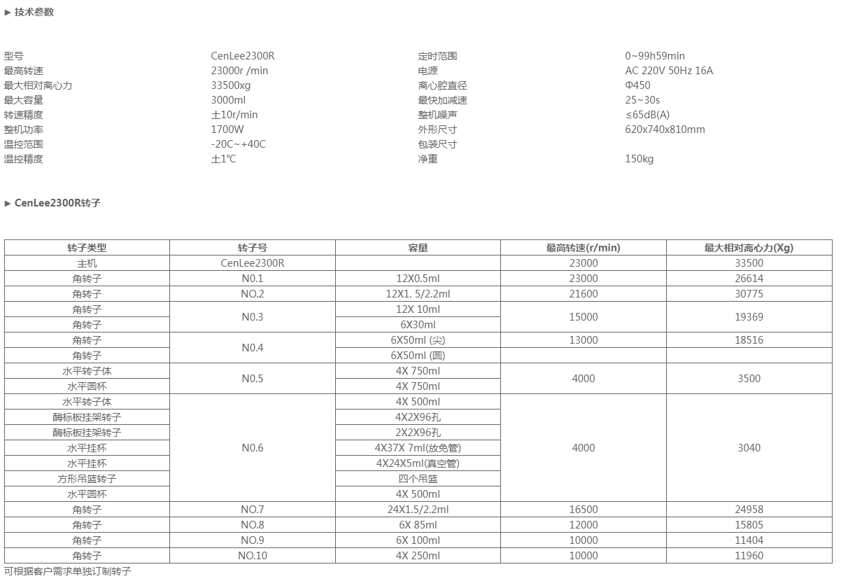 尺寸 : 最高转速23000 最大离心力33500 容量3000ml 主机带NO.1转子CenLee2300R——商品选配件 以下超链接 选购~~~ |