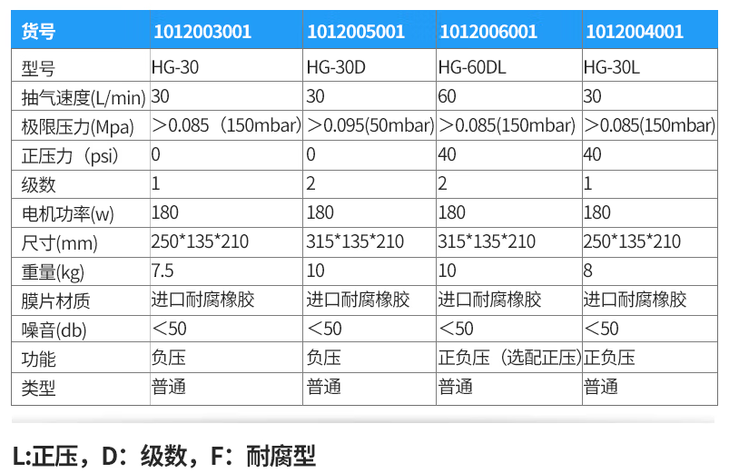 商品名称:HG系列隔膜泵//型号:HG-30L//参数:抽气速度:30L/min、>0.085(150mbar)、正压力:40Psi、级数:1、电机功率180、尺寸mm:250*135*210、8kg、<50dB、功能:正负压两用型,接口尺寸8mm,标配(内径φ7mm*外径φ12mm*长度φ800mm)真空管//编号:SEM-1012004001//更多产品欢迎查询我们官网:www.salmart.cn,销售人员QQ:439095771 QQ:996676869 电话:0755-33160345,13006636686