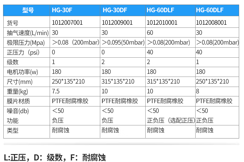 商品名称:HG系列隔膜泵//型号:HG-60DLF//参数:抽气速度:60L/min、>0.08(200mbar)、正压力:40Psi、级数:2、电机功率160、尺寸mm:315*135*210、10kg、<50dB、功能:正负压两用型,接口尺寸8mm,标配(内径φ7mm*外径φ12mm*长度φ800mm)真空管//编号:SEM-1012010001//更多产品欢迎查询我们官网:www.salmart.cn,销售人员QQ:439095771 QQ:996676869 电话:0755-33160345,13006636686