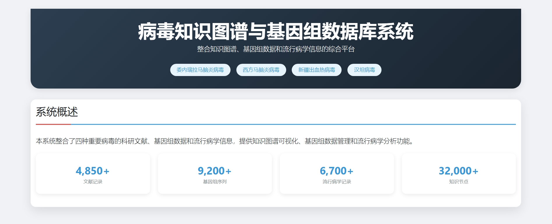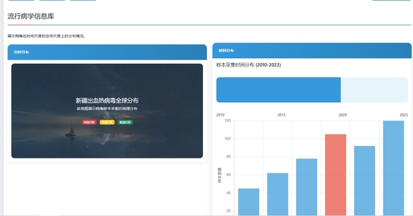 2.2 针对2.1中的四种病毒数据,分别构建基因组和流调信息库。其中基因组数据库展示病毒的序列编号、名称、节段信息(如有的话)、提交者、提交单位、提交日期、长度、采样日期、采样地点、宿主信息等内容;流调信息库重点展示病毒的采样日期、采样地点、宿主信息等在时间尺度和空间尺度上的分布,以序列信息列表、地图和时间标尺的形式展现。