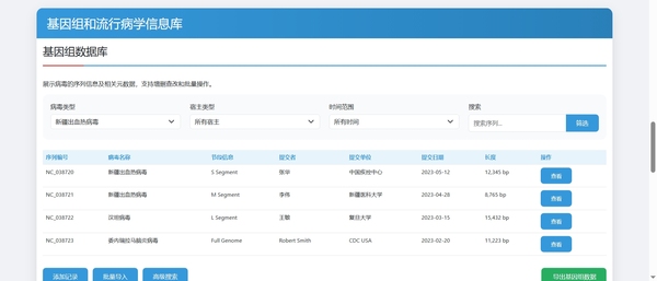 2.3 基因组数据库和流调信息库均具有可视化特性,支持数据的增、删、查、改操作,并支持根据特定字段和信息筛选或搜索记录,批量导入/导出记录等操作;