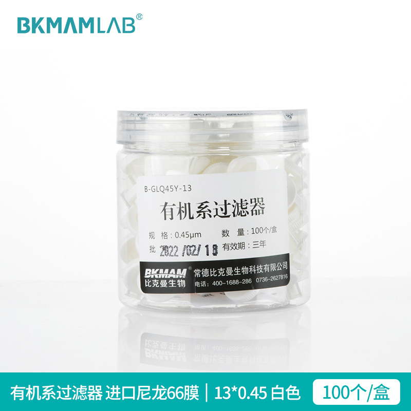 "比克曼生物针式过滤器微孔滤膜一次性过滤膜针头针筒式尼龙玻璃纤维PTFE有机系水系MCE膜滤膜滤头0.22 0.45um-有机系 进口尼龙66膜 13*0.45 白色 100个/盒"商品可能已被商家删除,您可查看其他相似商品!