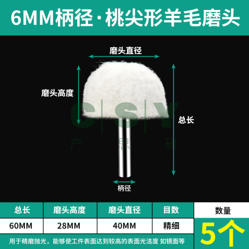 "保联羊毛抛光轮打磨头羊毛轮抛光头磨头玉石金属翡翠打磨工具镜面-6x40【桃尖形】5支"商品可能已被商家删除,您可查看其他相似商品!