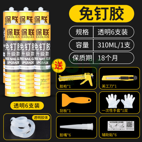 "免钉胶强力胶瓷砖免打孔粘胶透明玻璃胶水置物架踢脚线木工专用-升级型6支透明【速干强力】送1套工具"商品可能已被商家删除,您可查看其他相似商品!