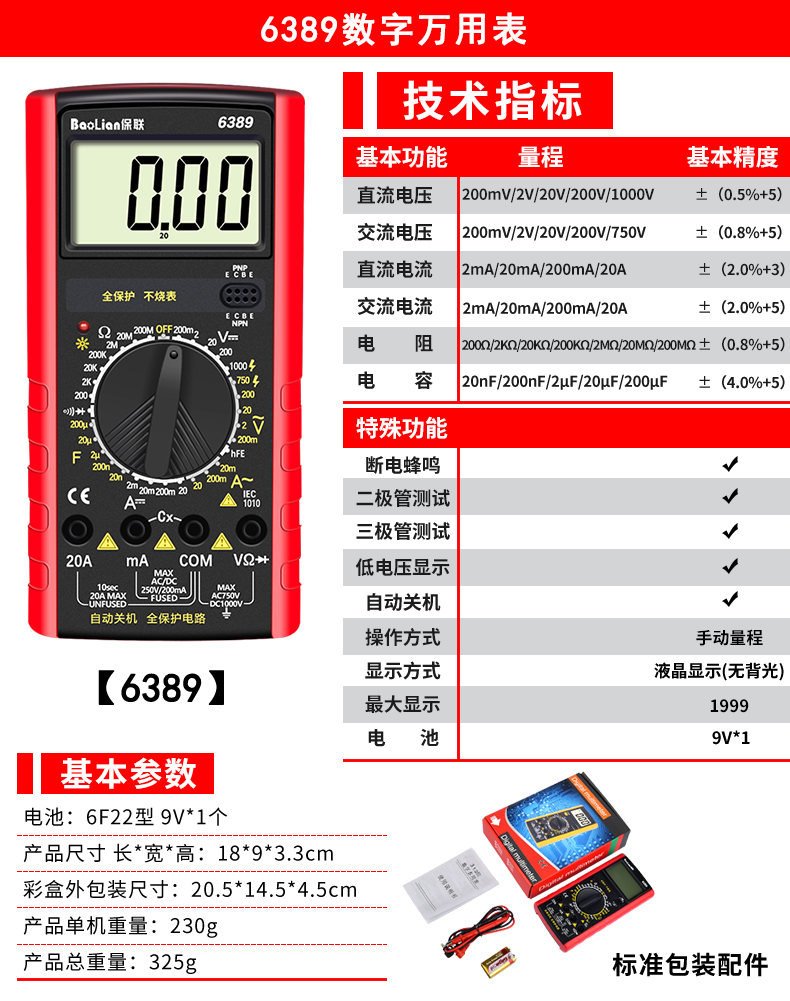 "万用表数字高精度电子防烧小型便捷式防护多功能数显电工维修测试-【经济实惠款】6389万用表 标配 手动量程"商品可能已被商家删除,您可查看其他相似商品!