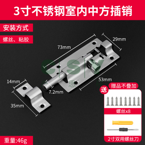 "不锈钢插销室内卫生间插销锁门扣门锁扣老式门销门窗防盗小插销锁-3寸 不锈钢室内中方插销(送螺丝+螺丝刀)"商品可能已被商家删除,您可查看其他相似商品!
