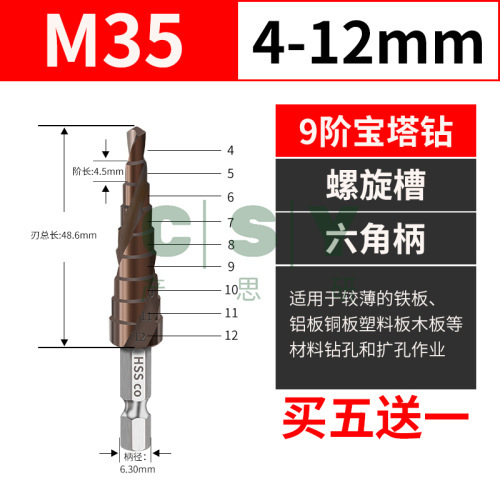 "宝塔钻头六角阶梯钻金属开孔器多功能扩孔梯形锥形孔钢铁打孔超硬-M35六角柄【4-12mm 9阶】螺旋槽"商品可能已被商家删除,您可查看其他相似商品!