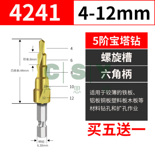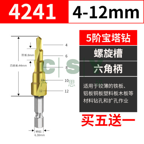 "宝塔钻头六角阶梯钻金属开孔器多功能扩孔梯形锥形孔钢铁打孔超硬-4241六角柄【4-12mm 5阶】螺旋槽"商品可能已被商家删除,您可查看其他相似商品!