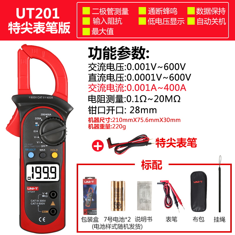 "优利德UT201高精度钳形表数字万用表数显电流表电阻交直流万能表 UT201(特尖表笔)"商品可能已被商家删除,您可查看其他相似商品!