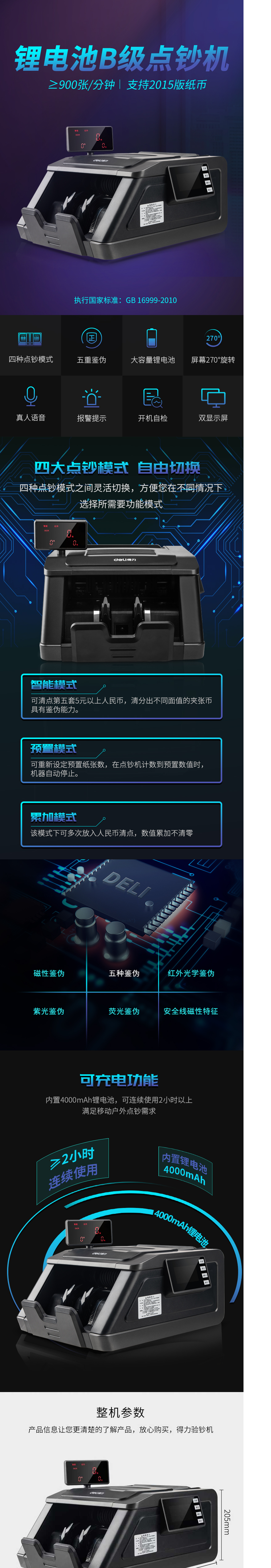 "得力(deli) 2193 支持2019年新版人民币 锂电池B级点钞机 四种点钞模式 五重鉴 银色"商品可能已被商家删除,您可查看其他相似商品!