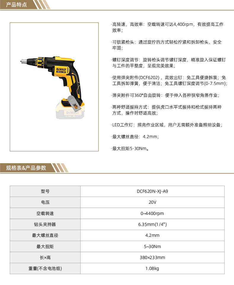 "20V锂电无刷链带螺丝枪 无电池及充电器 DCF620N-XJ-A9 1把"商品可能已被商家删除,您可查看其他相似商品!