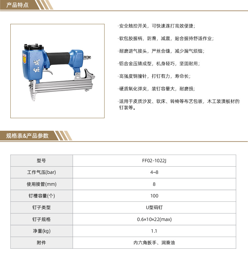 "气动码钉抢0.6*10*22mm(max) U型码钉 8mm接管 FF02-1022J 1把"商品可能已被商家删除,您可查看其他相似商品!
