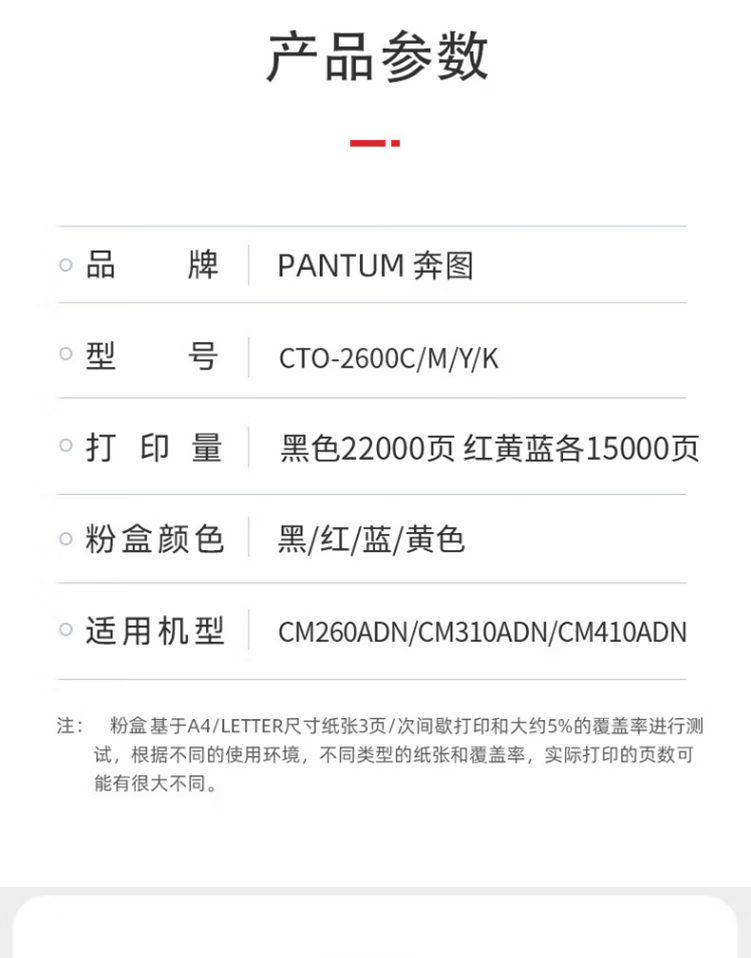 "奔图(PANTUM)CTO-2600C/M/Y/K 四色粉盒22000页 适用CM260ADN CM310ADN CM410ADN/CM270ADN"商品可能已被商家删除,您可查看其他相似商品!