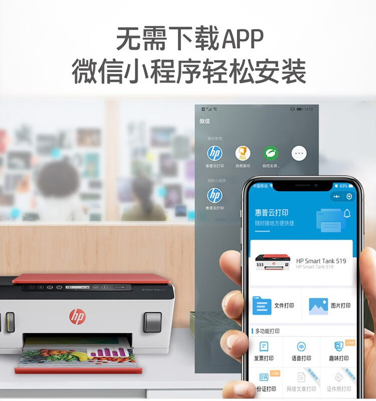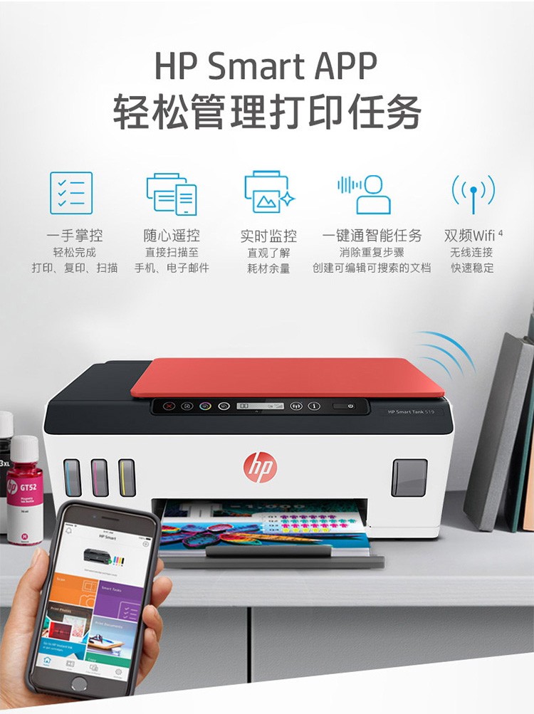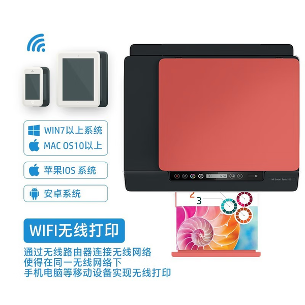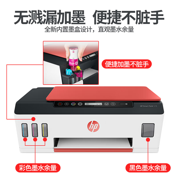 "惠普(HP)519/518 A4彩色喷墨连供一体机 墨仓式照片打印机家用 学生作业手机打印低成本 Tank519(免换墨盒/三合一)518红色款"商品可能已被商家删除,您可查看其他相似商品!