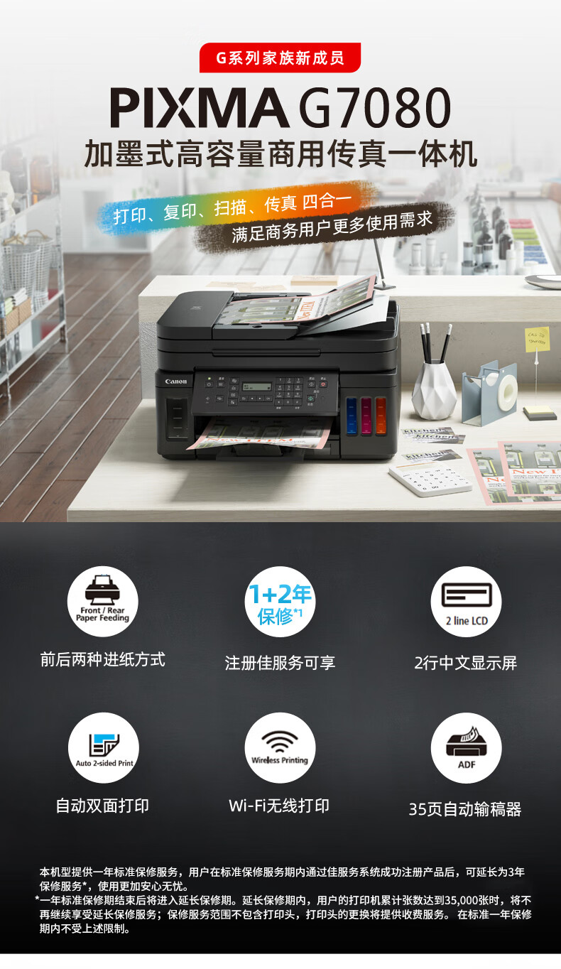 "佳能(Canon)G7080无线可加墨自动双面/输稿器多功能一体机(打印/复印/扫描/传真/照片 WiFi 商用)"商品可能已被商家删除,您可查看其他相似商品!