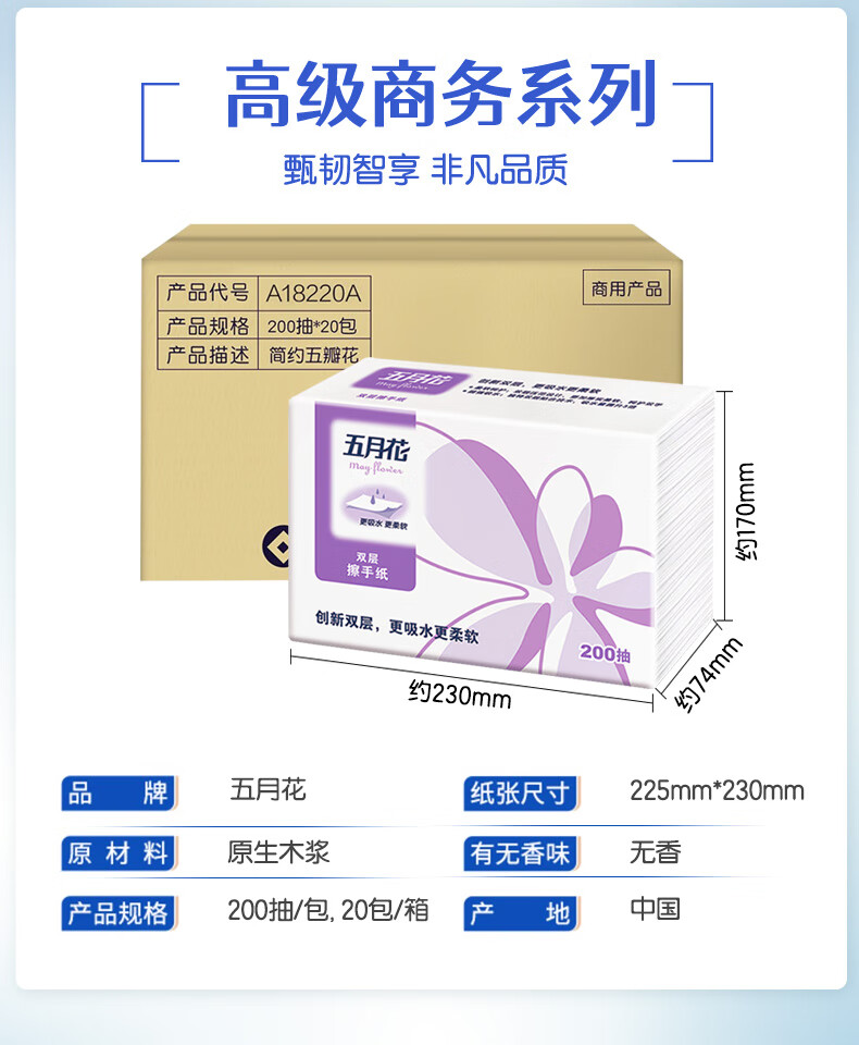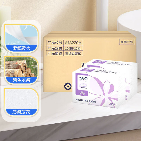"五月花(May Flower)抽纸 擦手纸2层200抽*20包 商务用纸酒店卫生间纸巾 整箱装"商品可能已被商家删除,您可查看其他相似商品!